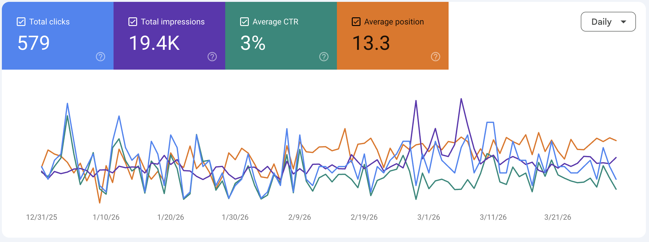 For a site that spent the first half of this 90-day period with average positions in the mid-to-high teens — solidly on page two for many searches — sustaining a 3% CTR means performing at roughly double the benchmark for those positions, every single day, for three months straight.