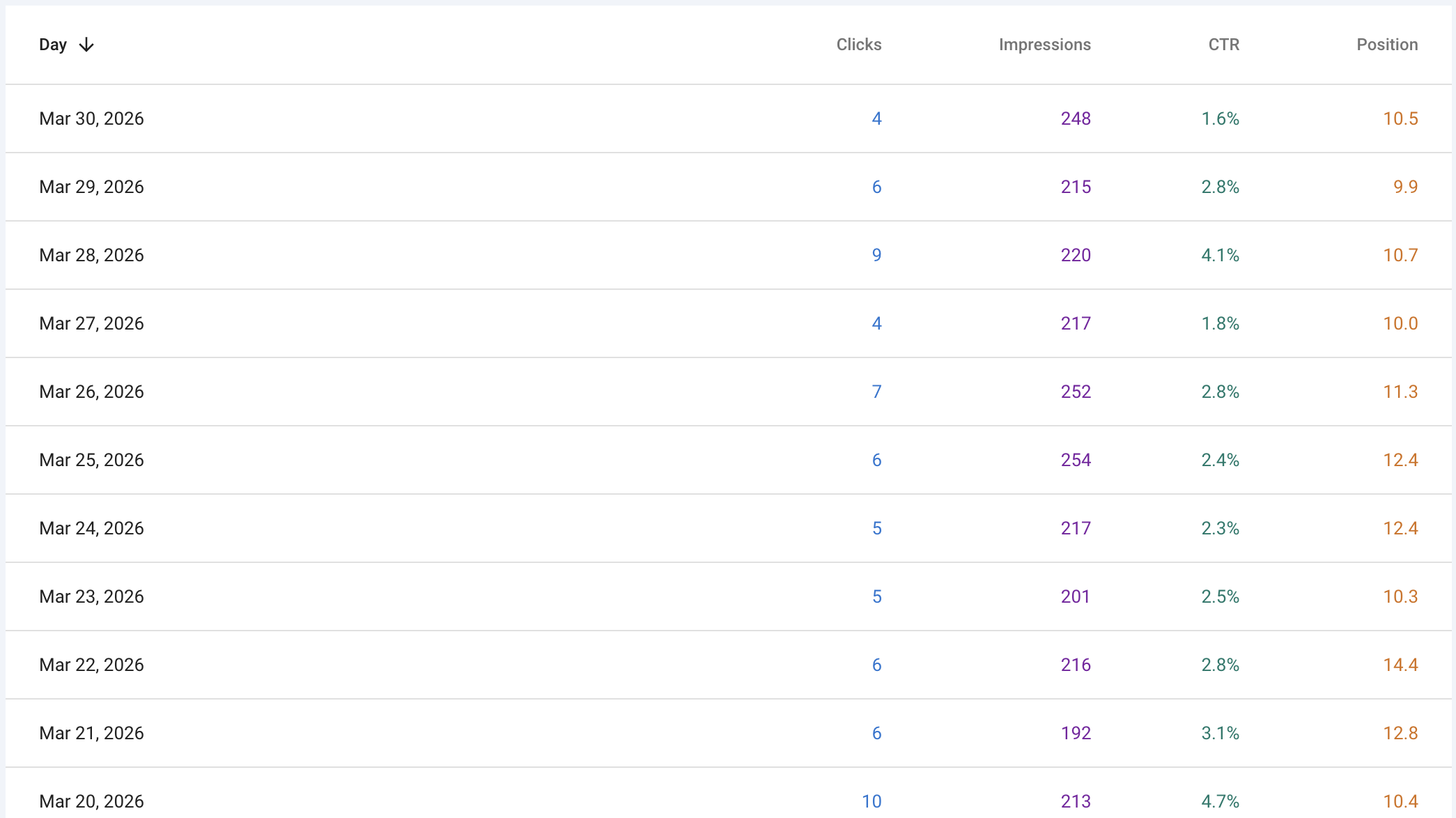 March 10th: 13 clicks from 242 impressions, 5.4% CTR, position 14.5. March 11th: 13 clicks from 260 impressions, 5% CTR, position 10.4. March 14th: 10 clicks, 4% CTR. March 18th: 8 clicks, 4.4% CTR. March 20th: 10 clicks, 4.7% CTR. March 28th: 9 clicks, 4.1% CTR.