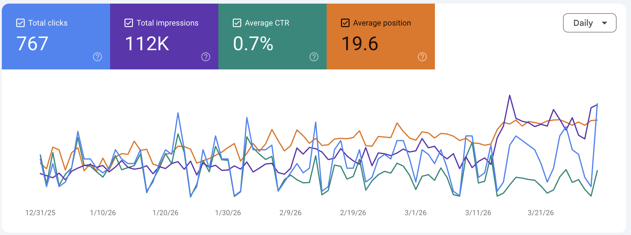 Some specific numbers worth internalizing: this firm went from averaging roughly 8 clicks per day in January to averaging roughly 11 clicks per day in February to averaging roughly 10 clicks per day in March — but with dramatically higher peaks, dramatically higher impressions, and dramatically better position. The daily average understates the trend because the growth is concentrated in the second half of March, where the best days of the entire quarter are clustered. April, if the trajectory holds, will look different again.