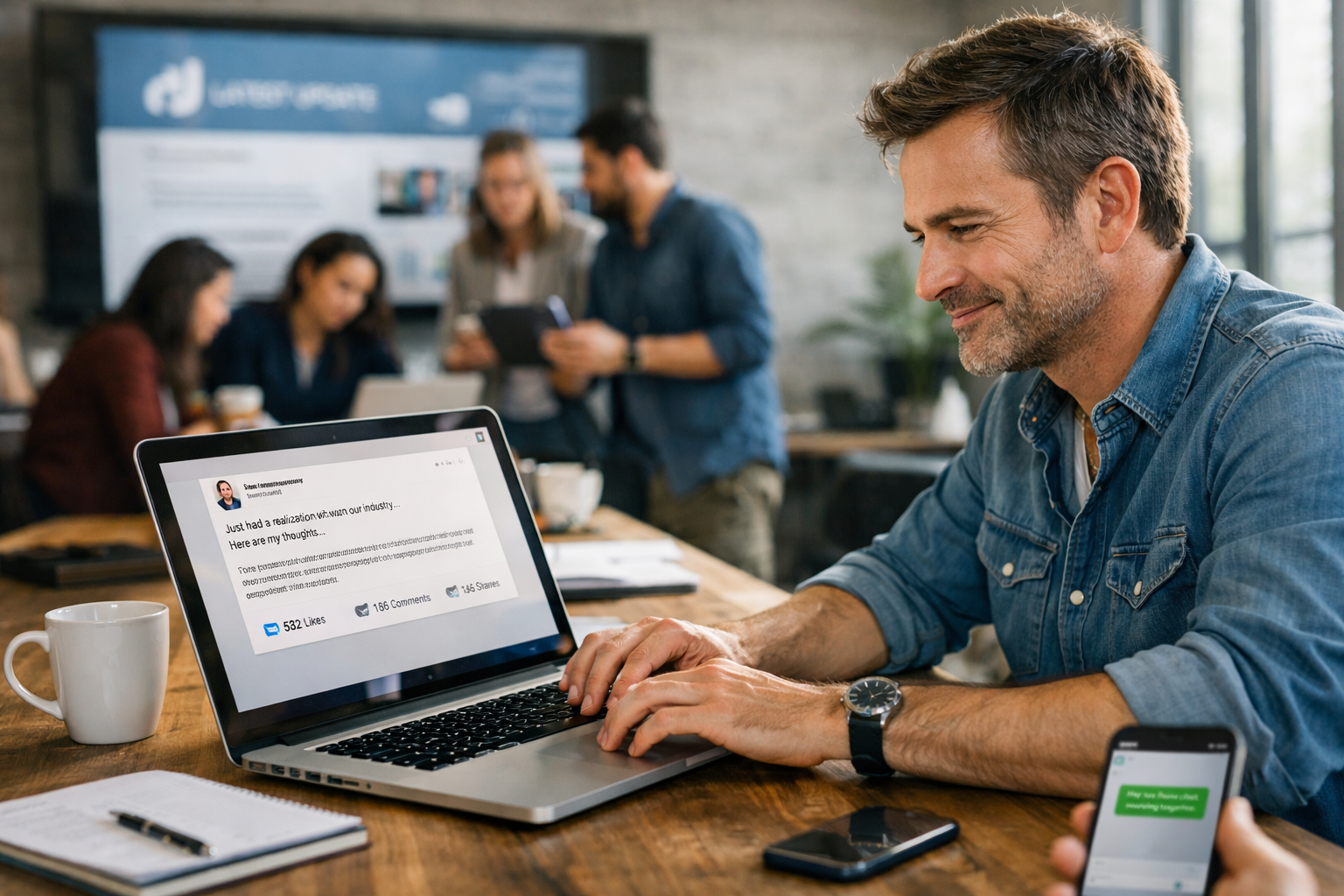 The founder posts something on LinkedIn. A genuine observation about their industry, a behind-the-scenes look at a decision they made, a honest account of something that went wrong and what they learned from it. No graphic design. No brand voice guidelines. No approval process. Just a person saying something real.